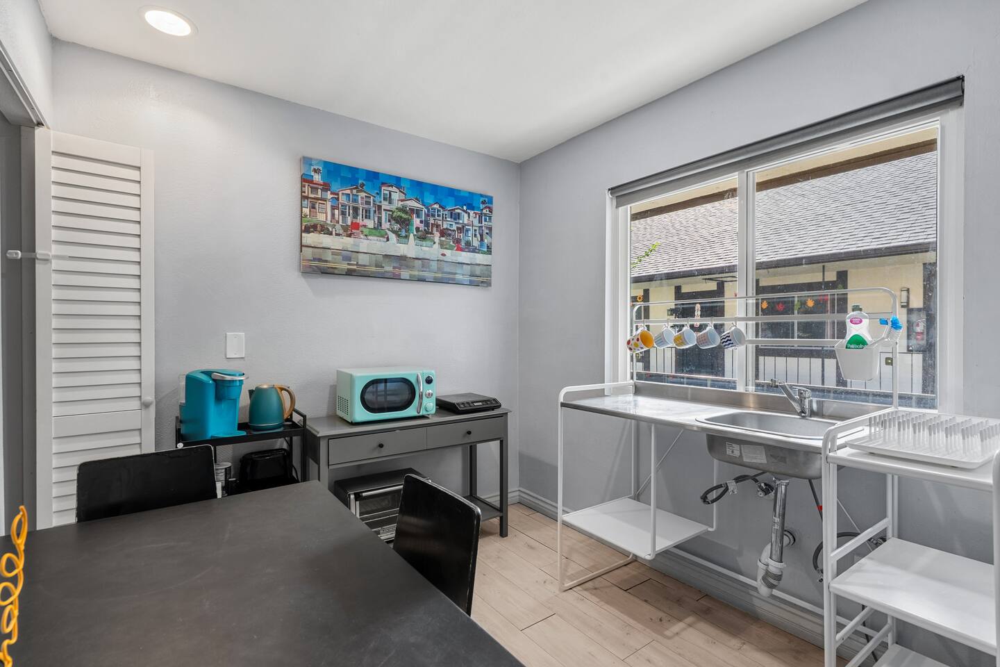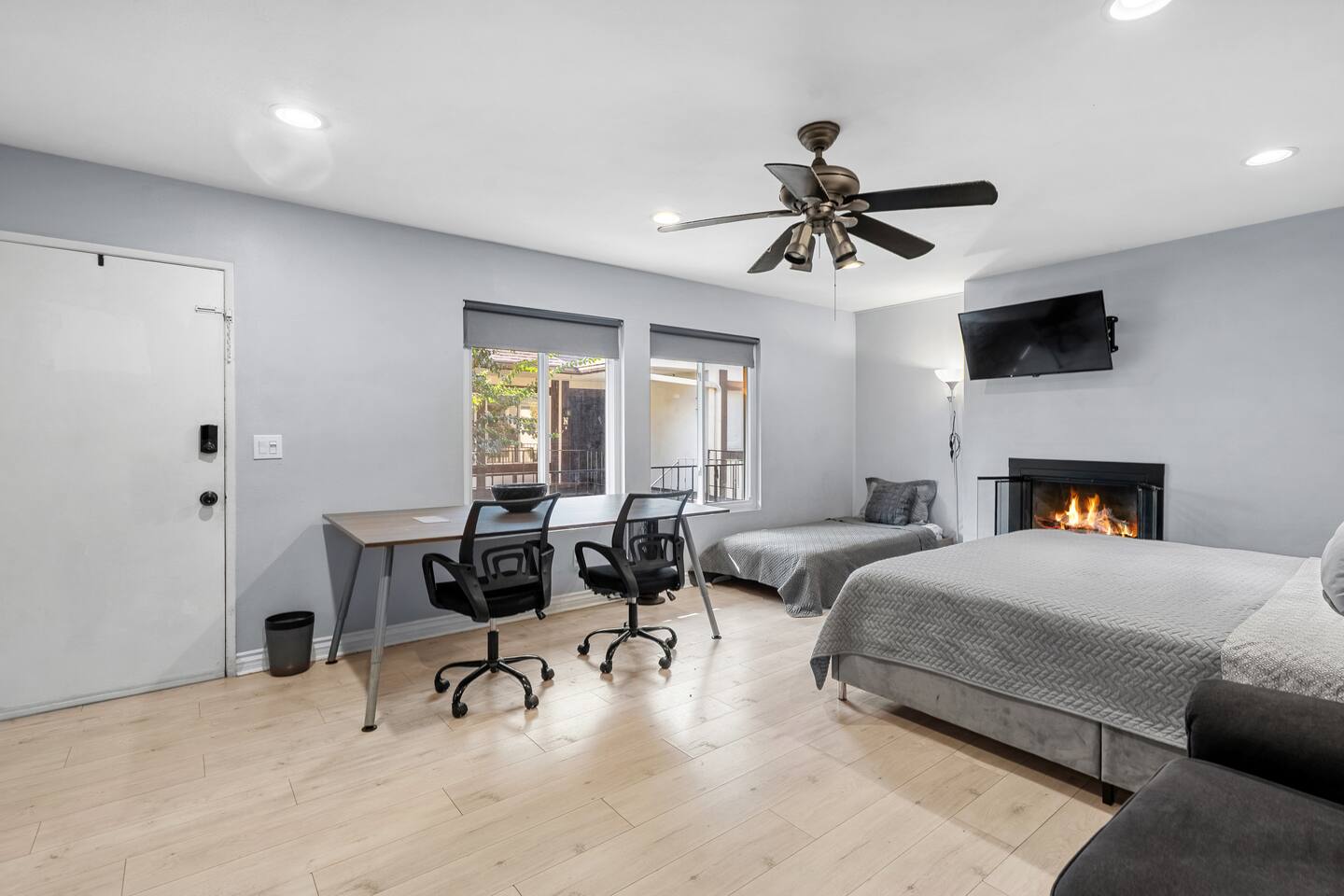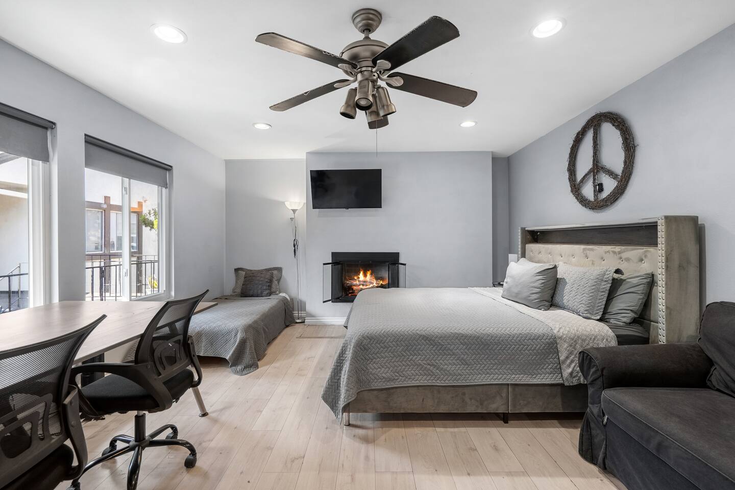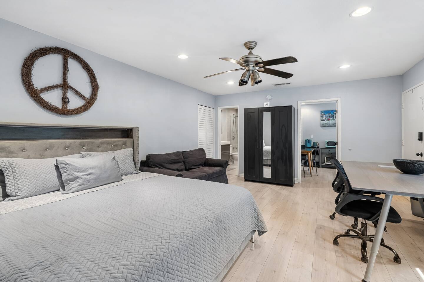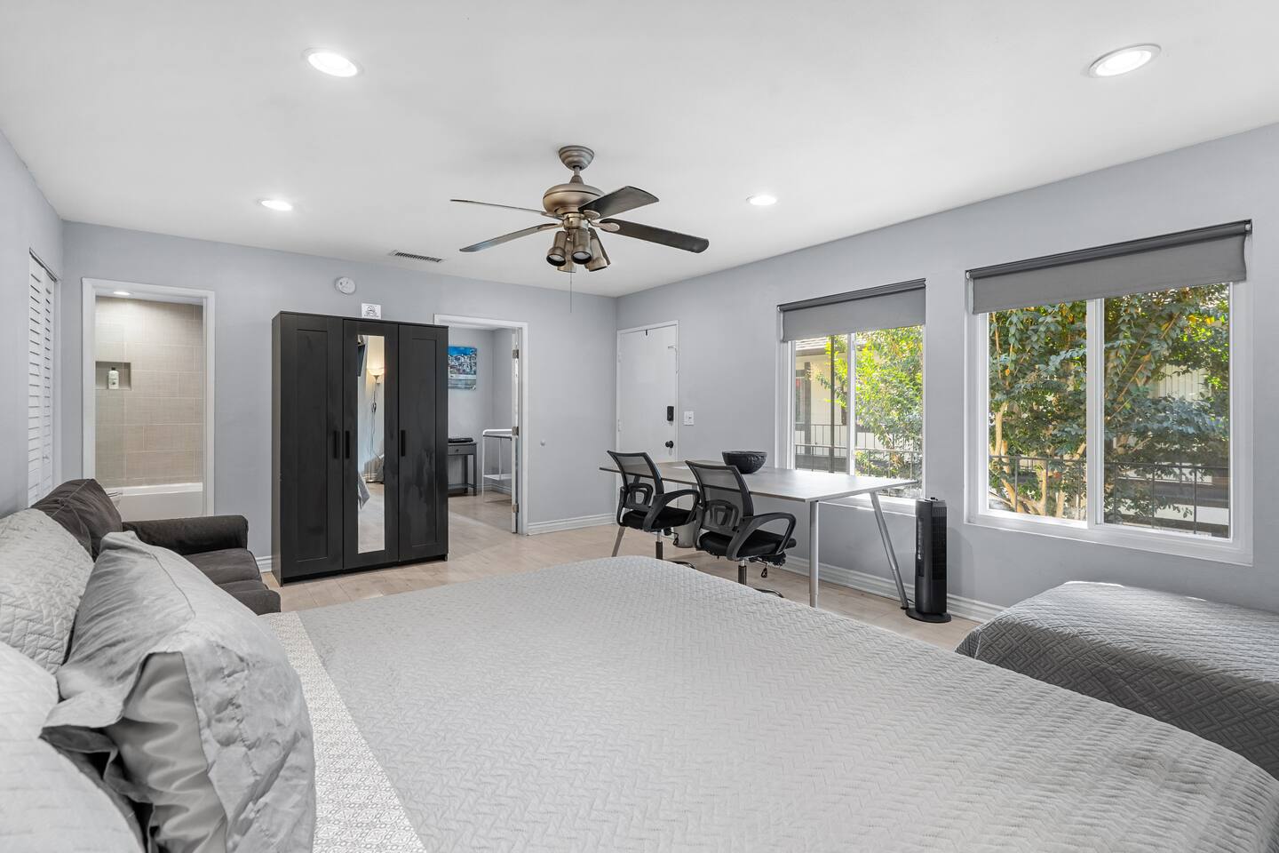A comfortable home base in the heart of Orange County, perfectly located for Disneyland, beaches, and easy family days out. Sleeps up to 5 guests in one open sleeping area with 1 king bed, 1 twin bed, a full-size sofa bed, and a crib. Includes a private bathroom, large work desk, and TV. Disneyland is 12 minutes away, and the Santa Ana Zoo is a 3-minute walk.