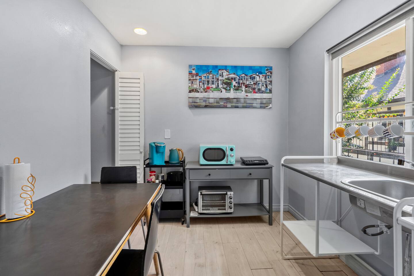 The space is a studio apartment, there is a separate private kitchenette and a separate private bathroom. Double the space of a regular hotel room. It’s around 800 sq ft. There is an outside staircase to reach the unit. Authentic, urban neighborhood with real local life—not a tourist hotspot. It’s central, safe and connected, but neighborhood may not feel polished.